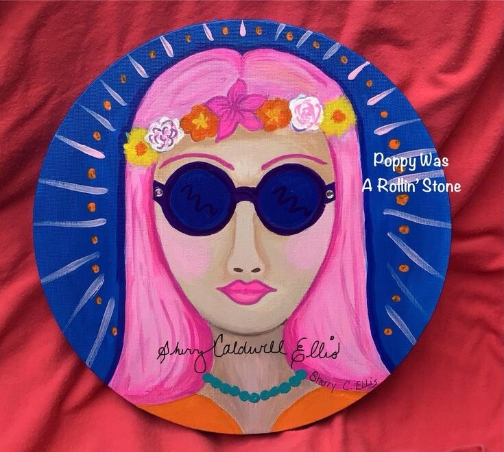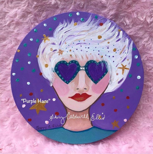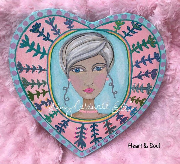 Acrylic on 10 inch wrapped round, heart-shaped, or scalloped canvas. All art is coated with a semi-gloss sealer and has hanging hardware attached. Some pieces have gemstone embellishments. My signature across the photos will not appear on the actual artwork. Prices vary.