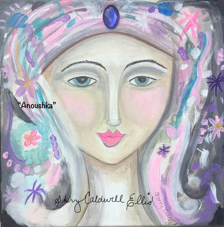 Acrylic on 12 inch round, heart-shaped or 12 x 12 inch sqaure wrapped canvas. All art is coated with a semi-gloss sealant and has hanging hardware. Some pieces have gemstone embellishments. Prices vary. My signature across each photo will not appear on the actual art.